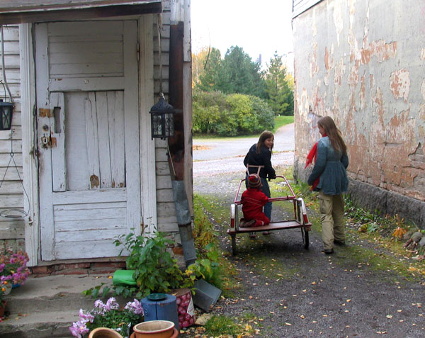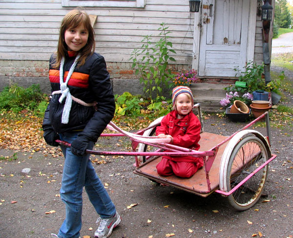 Hummani hei...! Annikin monta muuttoa ja roudausta kokeneille maitokärryille löytyy käyttöä myös lasten leikeistä. Huomatkaa oikeaoppiset (vanhoista kylpytakin vöistä tehdyt) valjaat.