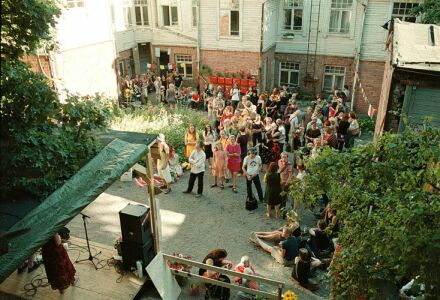 Sateesta huolimatta 4.7.02. järjestetty Pihatanssit-tapahtuma veti pihan täpötäyteen kaikenikäistä väkeä.