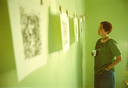 Näyttelyvieras Hanna Kuloviidan grafiikkanäyttelyn avajaisissa Galleria Mahdollisuuksien tilassa 13.7.02.