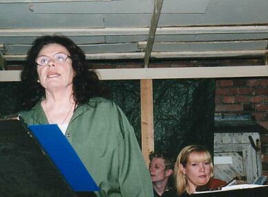 Annikki Tähti laulaa 4.7.02. Pihatansseissa Annikinkadun talkootyönä rakennetulla lavalla.