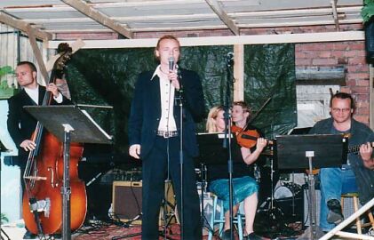 Ville Leinonen esiintyi Annikinkadun pihatansseissa 4.7.02. Ilkka Myllymäen orkesterin säestämänä.